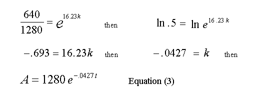 Substituting 640 for A, in Equation (2) and solving for k at t = 16.23 min. (34:14 min. - 18:00 min.), we have: