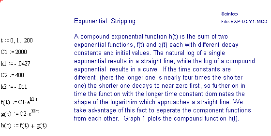 The 2 page attachment was created with MathSoft's Mathcad ver 4.0. Initial values and decay constants are selected in order to illustrate the method of exponential stripping and do not derive from actual data.
