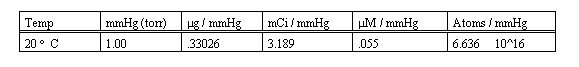 A factor from the table above, determined by the data units desired (mmHg (torr), g, mCi, (M etc.) is multiplied by the total reaction volume to determine the quanitation factor (QF) per mmHg.